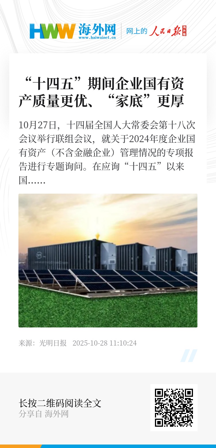 国有企业发展“有温度”。国铁集团打造“乡村振兴列车+”品牌,常态化开启公益性“慢火车”,30年没有涨价;国家电网近年来大力实施农网巩固提升工程,2024年投入1600亿元,农村供电可靠率达99.9%以上……在介绍国有企业扎实做好基础保障和民生服务工作、助力经济社会平稳健康运行时,郭婷婷表示,国有企业积极稳妥地推进碳达峰碳中和,加快发展方式绿色转型,切实扛起应急保障责任,文化企业持续巩固意识形态安全和文化安全,有力维护人民群众的生命财产安全和社会大局稳定。