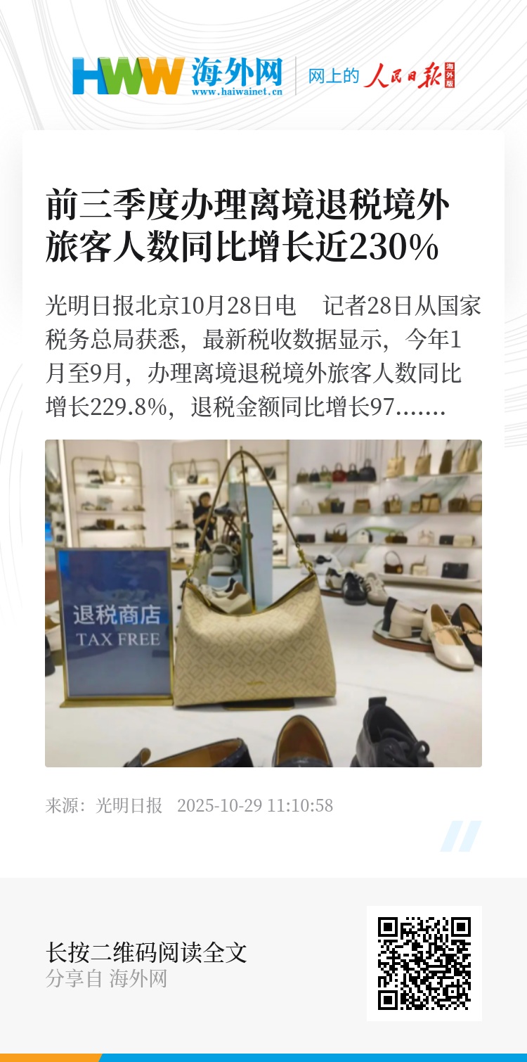 税务部门还探索在北京、上海、重庆、成都、广州等地的大型商圈设立“即买即退”集中退付点,境外旅客可实现“多点购物、一点退税”。此外,在上海、杭州等地推出离境退税“掌上办”和支付宝“一键退税”新功能,退税到账更高效。(记者 陈晨)