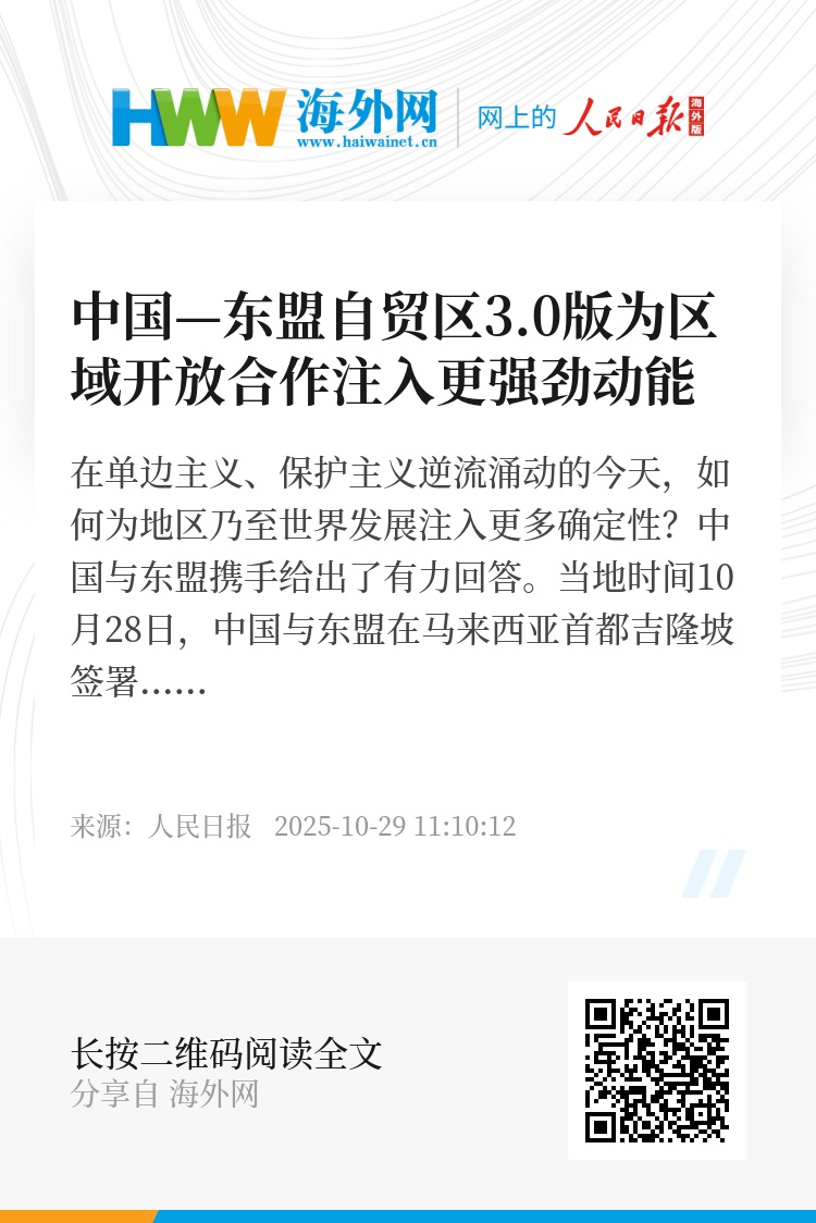建设中国—东盟自贸区3.0版,是共建超大规模市场、构建命运共同体的有效途径。连续5年互为最大贸易伙伴、2024年贸易总值近1万亿美元,截至今年7月,累计双向投资超4500亿美元,强劲的经贸合作为推动构建更加紧密的中国—东盟命运共同体提供不竭动力。在建设中国—东盟自贸区3.0版的过程中,双方将共同促进数字、绿色等新兴产业发展,同时加强标准、规制对接,促进基础设施和供应链互联互通,推动区域经济朝着更深层次一体化和长期稳定增长的目标迈进。“协定的条款对企业很有吸引力”“有利于共建一个更强有力、更具韧性的供应链”……双方企业界的热切期待,充分印证自贸区升级将加速释放中国东盟合作潜力。