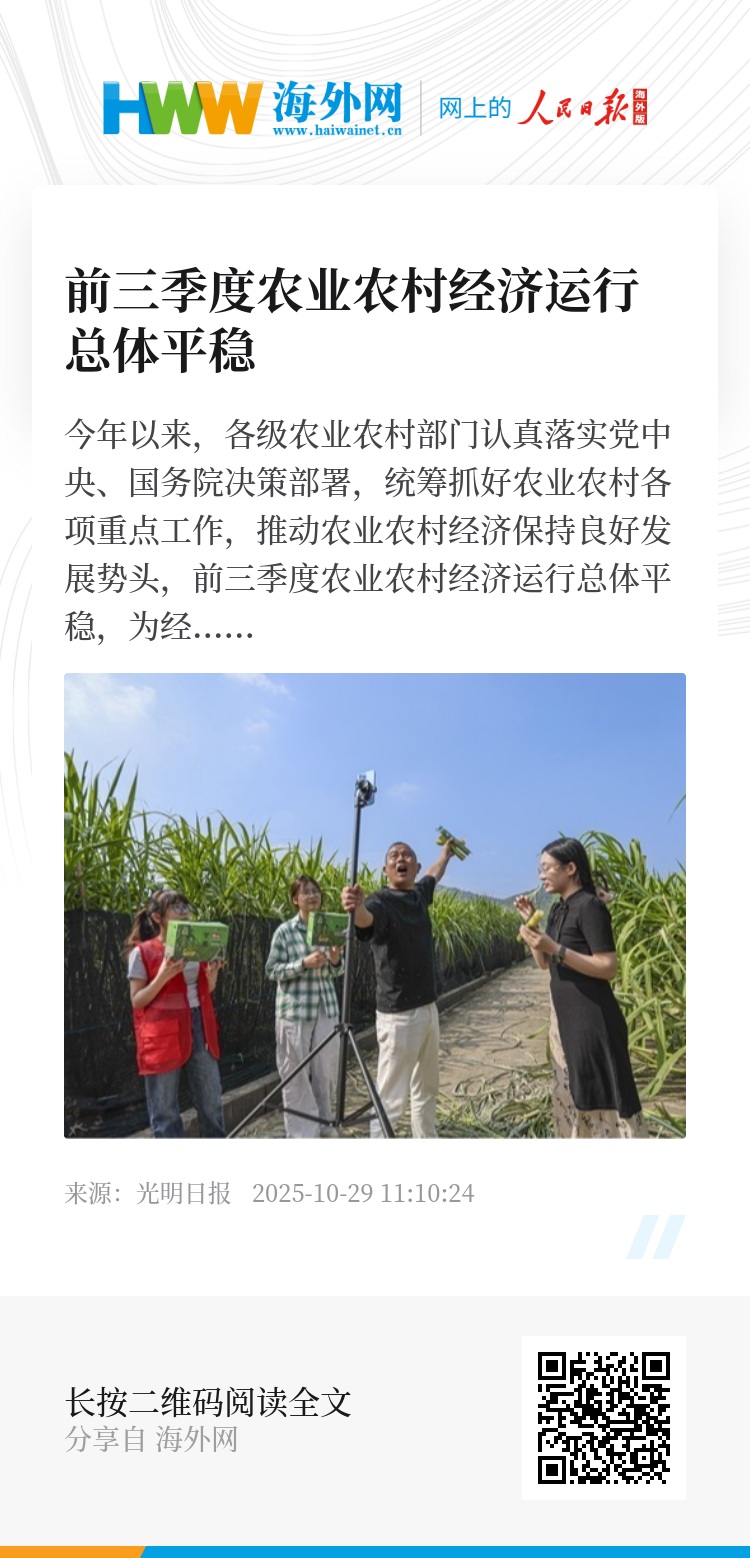 今年以来,各级农业农村部门认真落实党中央、国务院决策部署,统筹抓好农业农村各项重点工作,推动农业农村经济保持良好发展势头,前三季度农业农村经济运行总体平稳,为经济社会高质量发展提供了有力支撑。