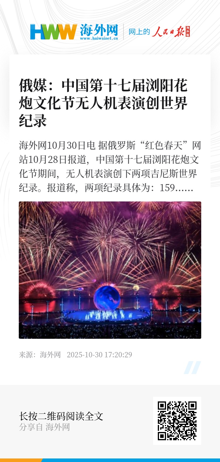 海外网10月30日电 据俄罗斯“红色春天”网站10月28日报道,中国第十七届浏阳花炮文化节期间,无人机表演创下两项吉尼斯世界纪录。