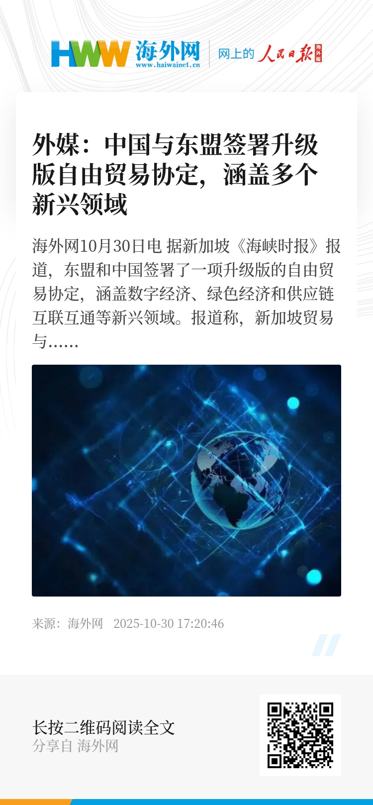 海外网10月30日电 据新加坡《海峡时报》报道,东盟和中国签署了一项升级版的自由贸易协定,涵盖数字经济、绿色经济和供应链互联互通等新兴领域。