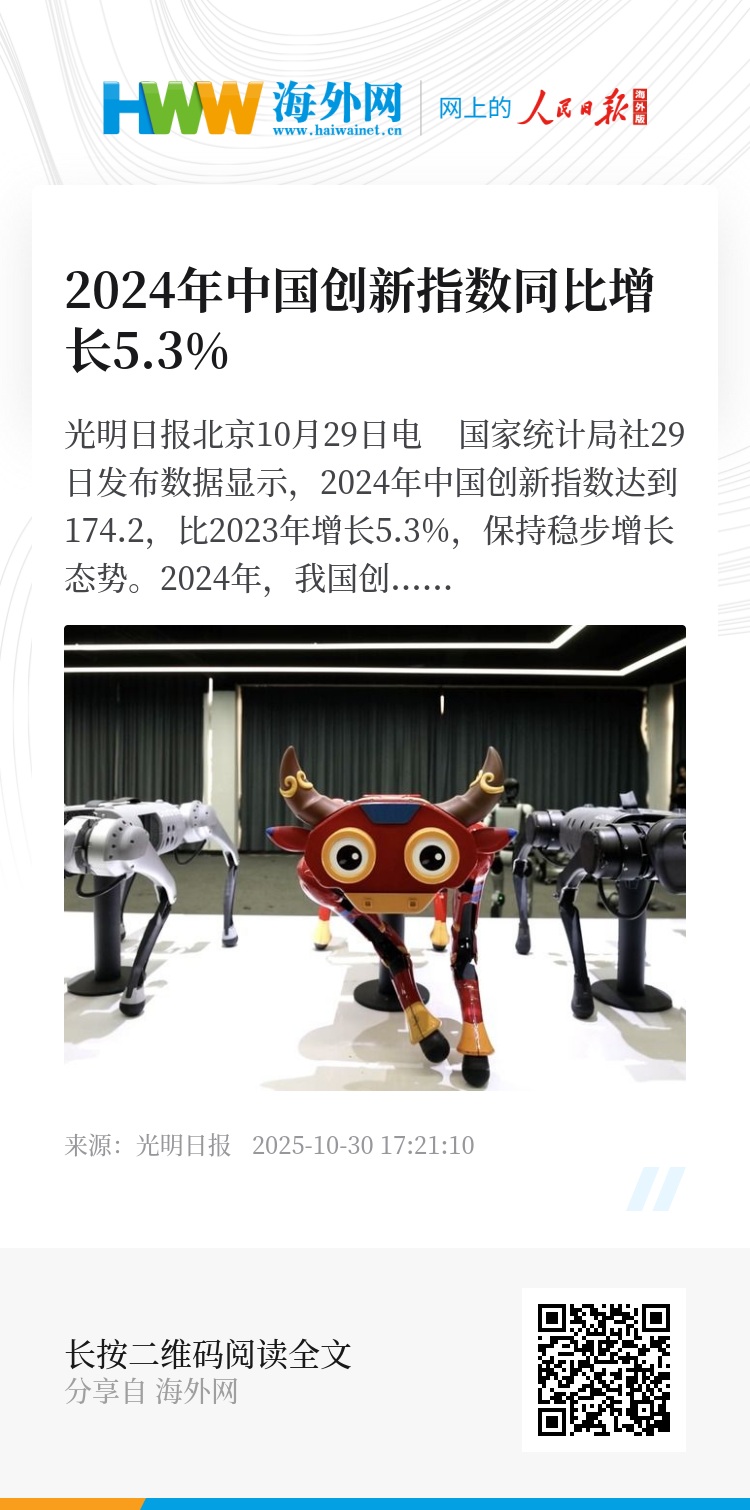 光明日报北京10月29日电 国家统计局社29日发布数据显示,2024年中国创新指数达到174.2,比2023年增长5.3%,保持稳步增长态势。
