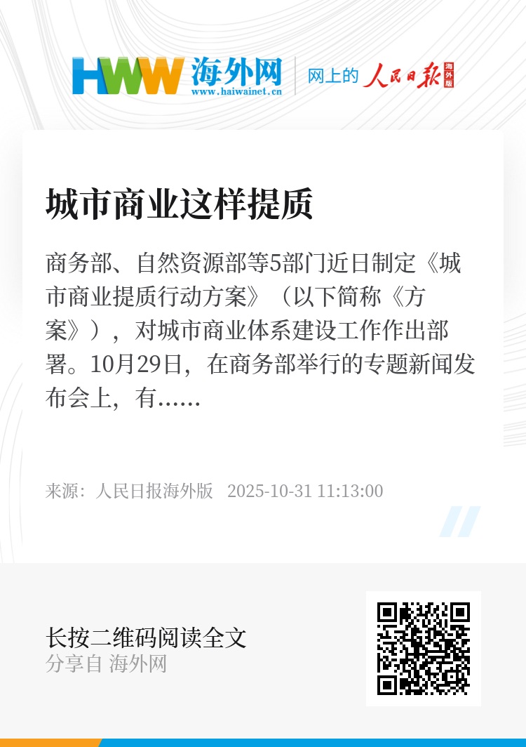 商务部流通发展司一级巡视员张祥说,城市商业贴近百姓生活,是集聚优质商业资源、满足居民日常购物休闲需求的重要平台,更是优化消费环境、创造消费需求、提升消费体验的重要载体。《方案》提出结合城市更新,实施城市商业提质行动,构建以全国示范步行街(商圈)为引领、特色商业街区为支撑、一刻钟便民生活圈为基础,布局合理、设施齐全、业态丰富、供给优质、安全便利的城市商业体系,更好满足人民美好生活需要。