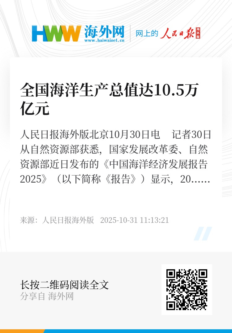 人民日报海外版北京10月30日电 记者30日从自然资源部获悉,国家发展改革委、自然资源部近日发布的《中国海洋经济发展报告2025》(以下简称《报告》)显示,2024年海洋经济各项工作不断取得突破,全国海洋生产总值达到10.5万亿元,海洋经济规模持续扩大,海洋产业结构加快调整,海洋科技创新能力显著增强,海洋资源集约节约利用水平不断提升,海洋生态保护修复及预警监测工作取得成效,海洋经济对外开放合作不断深化。