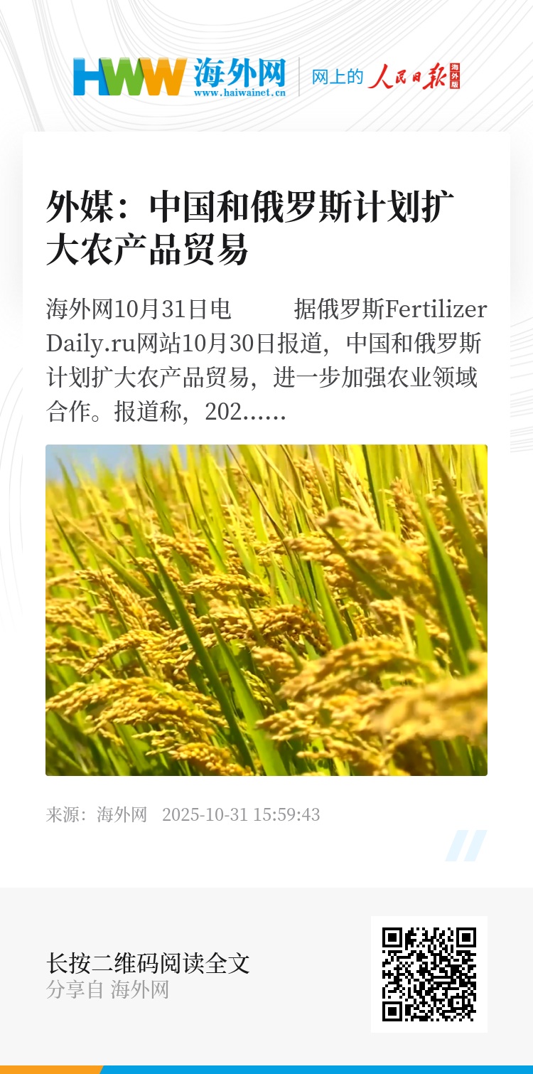 海外网10月31日电 据俄罗斯Fertilizer Daily.ru网站10月30日报道,中国和俄罗斯计划扩大农产品贸易,进一步加强农业领域合作。