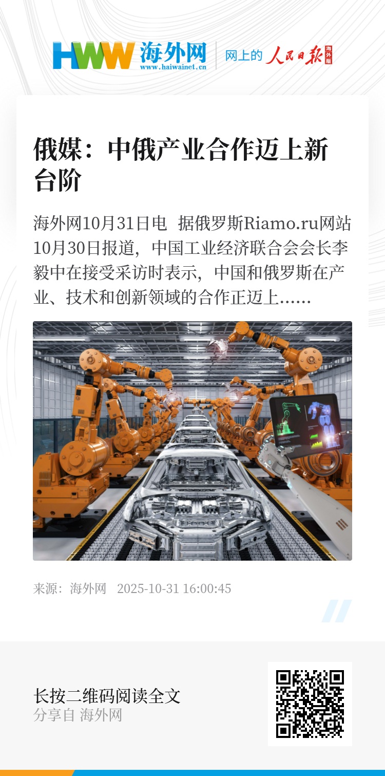 海外网10月31日电 据俄罗斯Riamo.ru网站10月30日报道,中国工业经济联合会会长李毅中在接受采访时表示,中国和俄罗斯在产业、技术和创新领域的合作正迈上新台阶,为两国经济可持续增长奠定了坚实基础。
