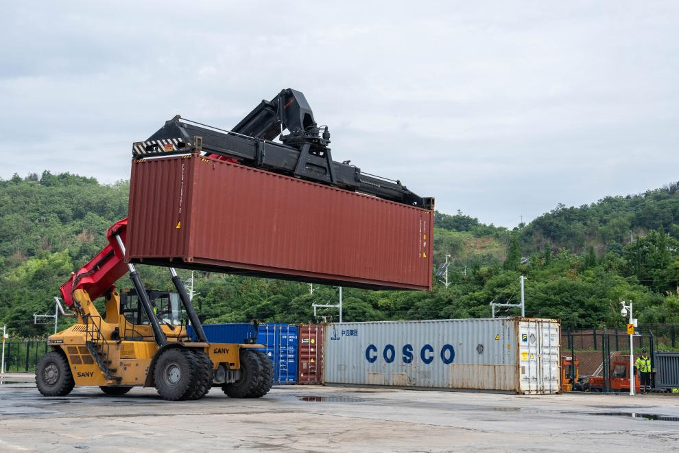 图为工作人员在株洲中车物流园进行集装箱装车作业。新华社记者 陈思汗 摄