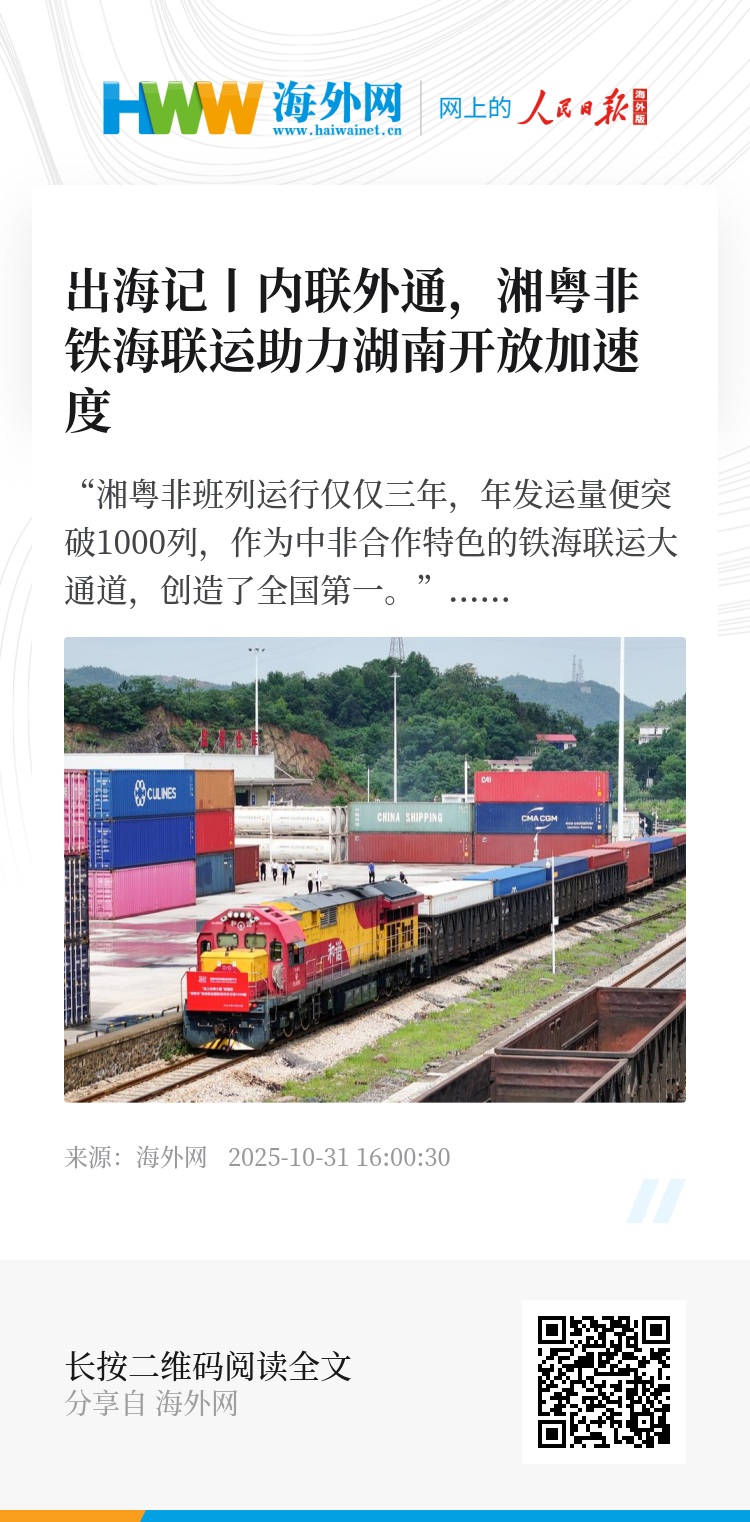 从株洲场站的繁忙装卸到非洲港口的货物集散,湘粤非铁海联运通道用1800余列的累计发运量写下了湖南对外开放的亮眼答卷,更以全方位的服务升级,成为破解内陆省份“出海”难题的关键路径。面向未来,湘粤非铁海联运必将在深化中非经贸合作征程上,持续释放“内联外通”的澎湃动能,书写更多联通世界、合作共赢的新篇章。(海外网 张英杰)