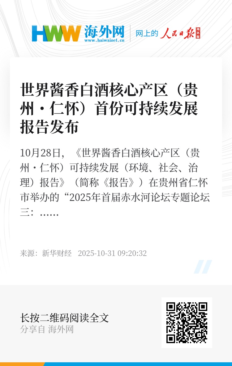 10月28日,《世界酱香白酒核心产区(贵州・仁怀)可持续发展(环境、社会、治理)报告》(简称《报告》)在贵州省仁怀市举办的“2025年首届赤水河论坛专题论坛三:酒业数字化高质量发展”上正式发布。《报告》既是世界酱香白酒核心产区(贵州・仁怀)发展历程中的重要里程碑,也是全球首部以白酒产区为核心的可持续发展报告,标志着中国白酒产业在绿色、高质量转型方面迈出关键一步。