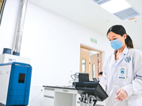 七月二十二日,在江西省赣州市章贡区广东省人民医院赣州医院沙河院区,医护人员操作智能化物流传输系统传送物品。
