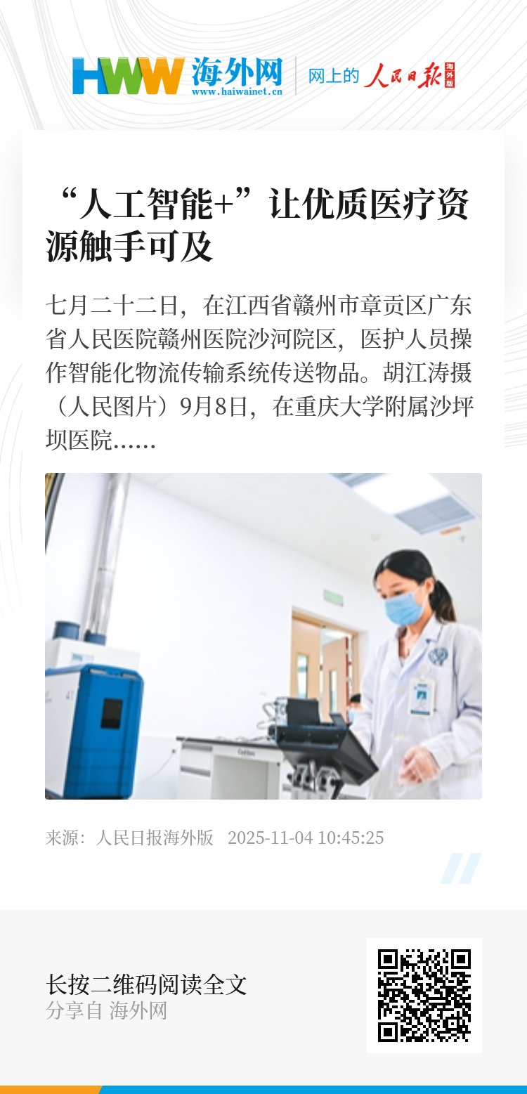 AI(人工智能)眼底相机快速筛查儿童眼疾、陪伴型机器人助力孤独症早筛、中医经络调理机器人精准按摩、医疗大模型提供全流程问诊、动态血糖监测系统实时预警、AI为慢病患者定制健康方案……近年来,随着AI推动数字医疗加速发展,从儿童到老人,从预防到治疗,“人工智能+”让优质医疗资源触手可及。