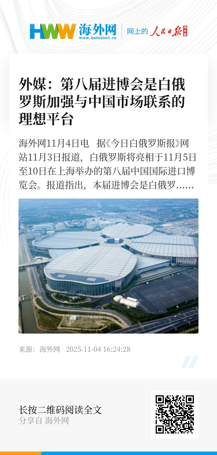 海外网11月4日电 据《今日白俄罗斯报》网站11月3日报道,白俄罗斯将亮相于11月5日至10日在上海举办的第八届中国国际进口博览会。报道指出,本届进博会是白俄罗斯推广本土产品、扩大市场份额、深化与中国市场联结的理想平台。