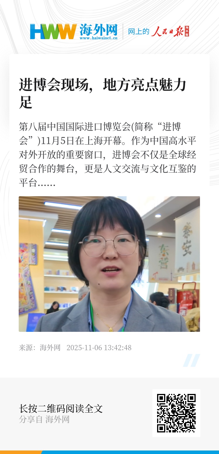 第八届中国国际进口博览会(简称“进博会”)11月5日在上海开幕。作为中国高水平对外开放的重要窗口,进博会不仅是全球经贸合作的舞台,更是人文交流与文化互鉴的平台。多地组织参展,老字号、非物质文化遗产、旅游资源、新科技等在此齐聚。浙江省商务厅副厅长陈志成、山东省商务厅商贸发展处副处长陈晓、大连市投资促进中心副主任张军接受人民日报海外网采访,畅谈此次呈现的地方特色亮点。