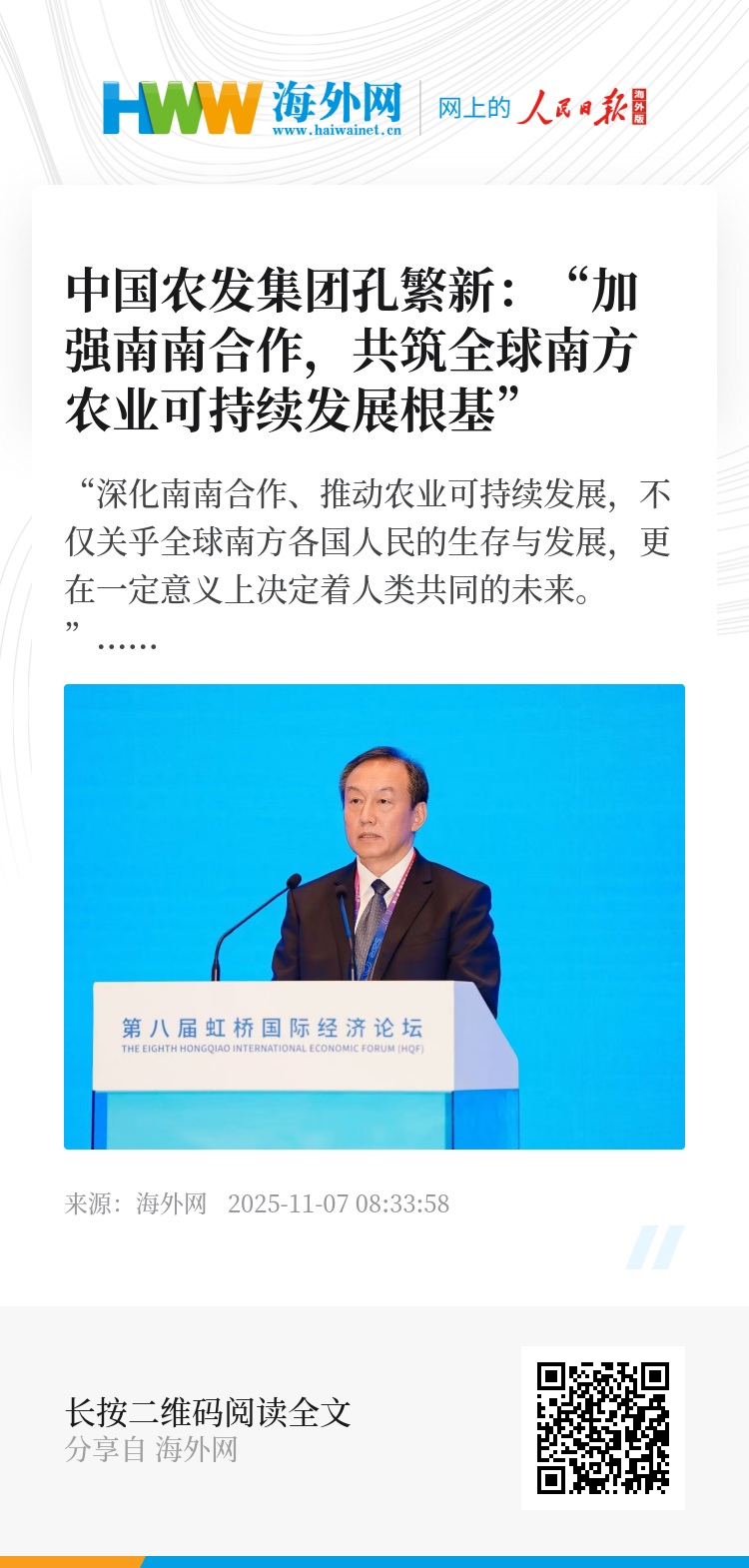 11月6日,由商务部主办的第八届虹桥国际经济论坛“全球南方农业可持续发展交流对话”分论坛在国家会展中心(上海)举行。中国农业发展集团有限公司党委书记、董事长孔繁新在论坛发表题为“加强南南合作,共筑全球南方农业可持续发展根基”的讲话。