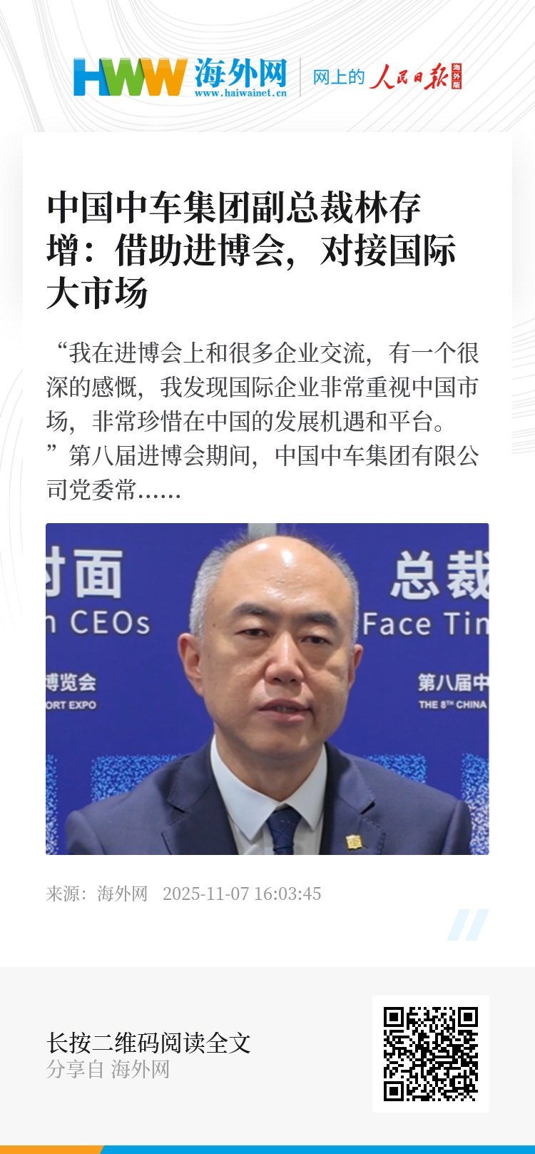 “我在进博会上和很多企业交流,有一个很深的感慨,我发现国际企业非常重视中国市场,非常珍惜在中国的发展机遇和平台。”第八届进博会期间,中国中车集团有限公司党委常委、副总裁林存增接受人民日报海外网采访时表示,中国中车借助进博会平台,与全球众多知名企业建立长期稳定的合作关系,不断拓展国际合作,与合作伙伴共同探索新能源、新技术合作,彰显先进装备制造业企业的责任担当与积极作为。