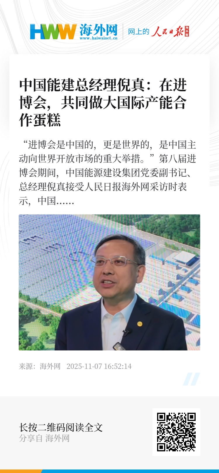 “进博会是中国的,更是世界的,是中国主动向世界开放市场的重大举措。”第八届进博会期间,中国能源建设集团党委副书记、总经理倪真接受人民日报海外网采访时表示,中国能建作为进博会的坚定支持者、积极推动者、深度参与者和切实受益者,借助这个大平台,全方位参与高质量共建“一带一路”,共同做大国际产能合作蛋糕。