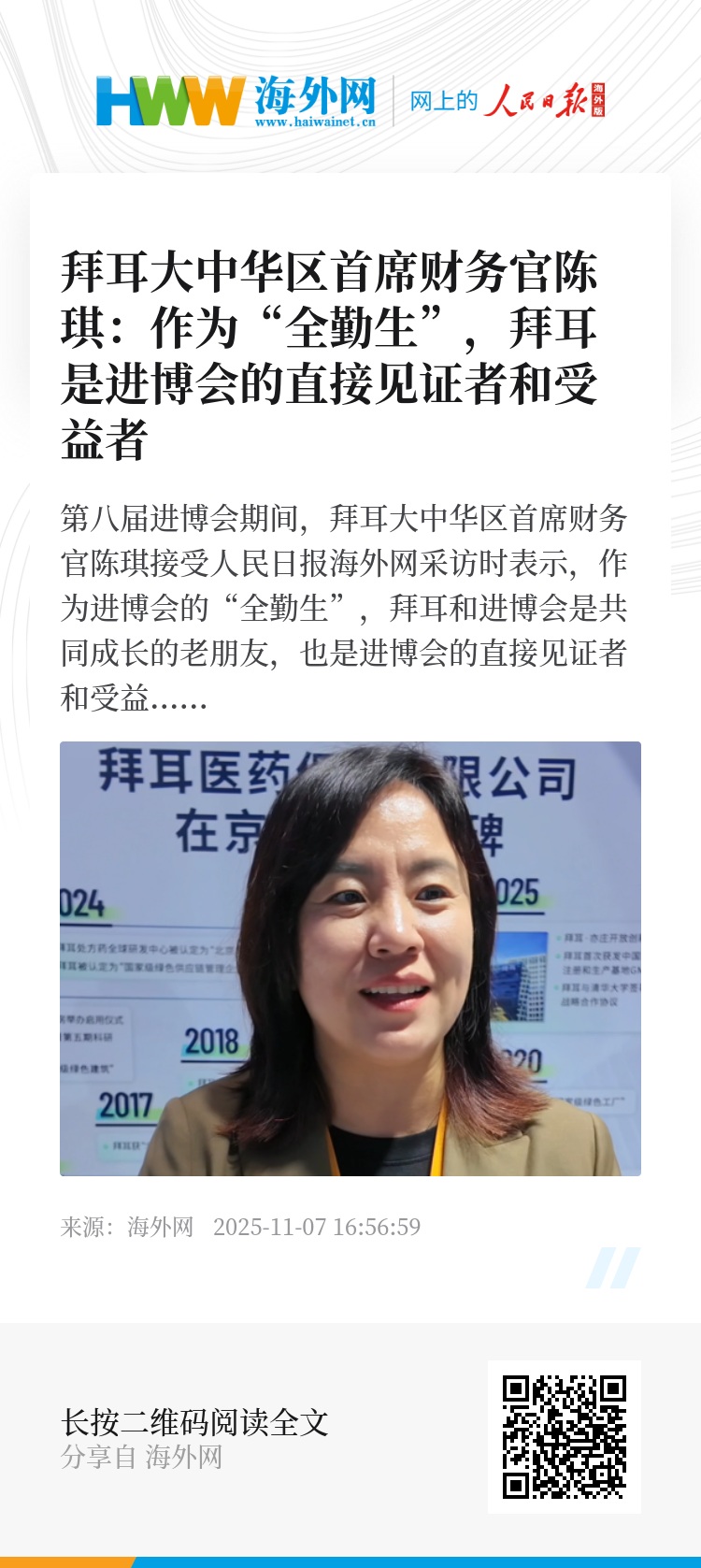 第八届进博会期间,拜耳大中华区首席财务官陈琪接受人民日报海外网采访时表示,作为进博会的“全勤生”,拜耳和进博会是共同成长的老朋友,也是进博会的直接见证者和受益者。