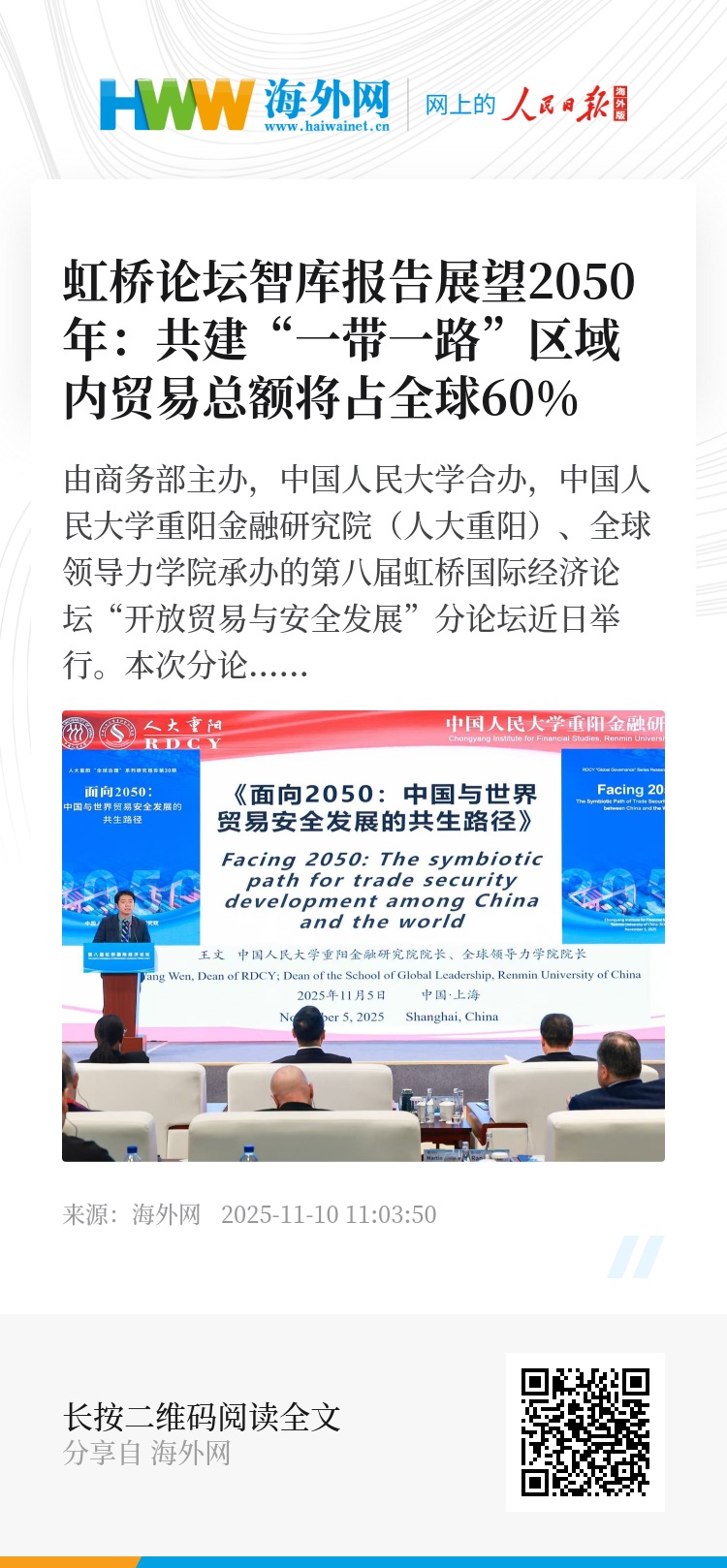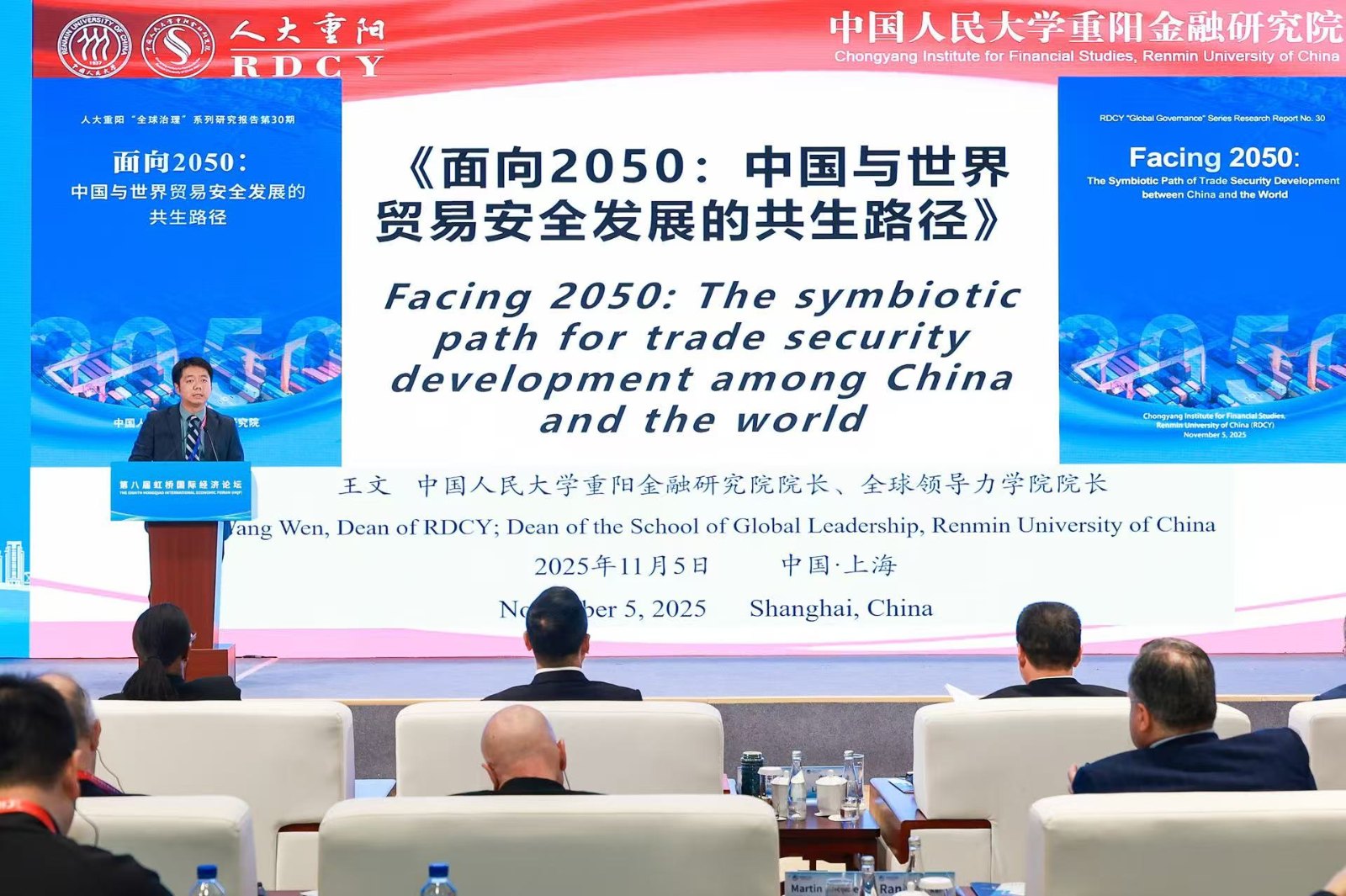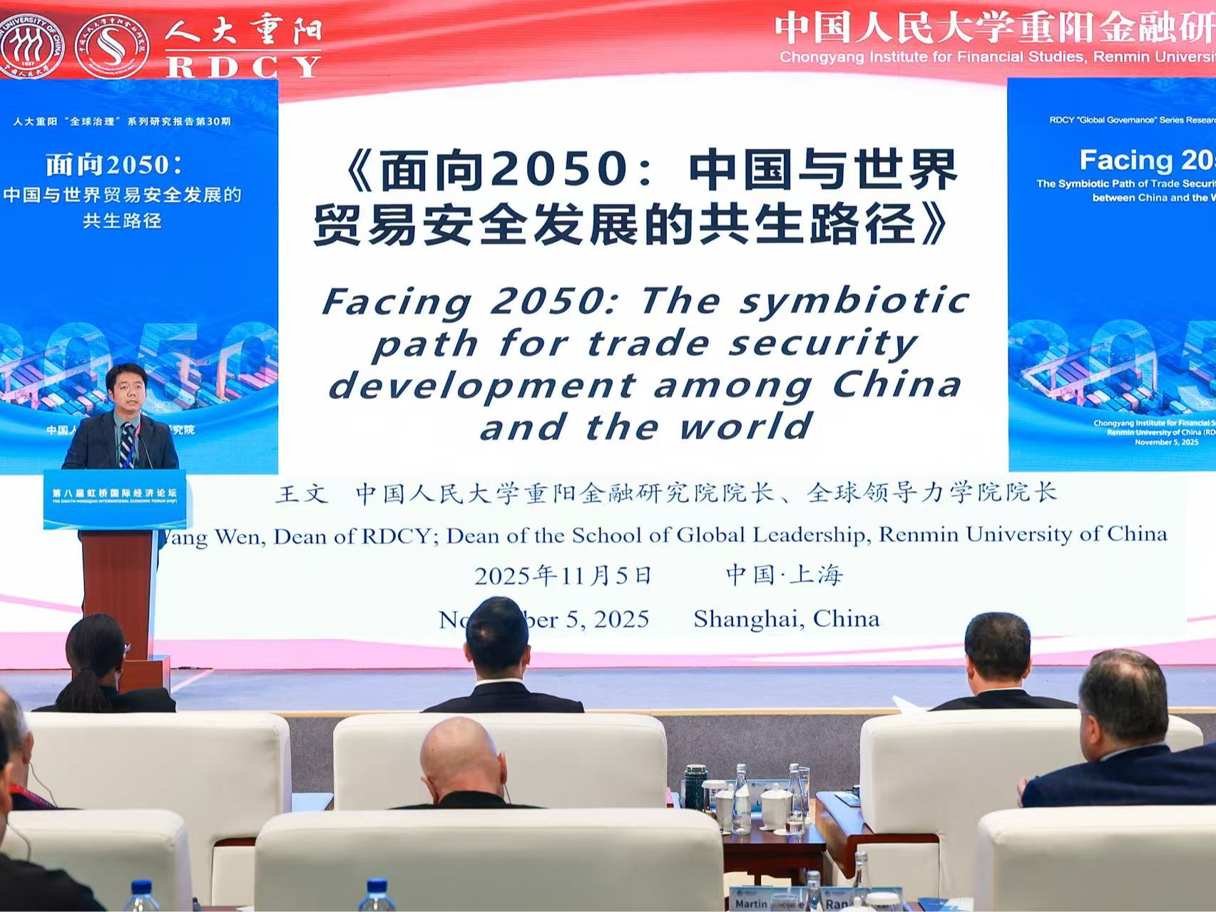 由商务部主办,中国人民大学合办,中国人民大学重阳金融研究院(人大重阳)、全球领导力学院承办的第八届虹桥国际经济论坛“开放贸易与安全发展”分论坛近日举行。本次分论坛直面全球经贸核心议题,来自中外学界、战略界、企业界与智库机构的近20名专家学者深入探讨如何构建开放、包容、普惠、平衡、共赢的全球经贸体系。作为虹桥论坛四家智库合作伙伴之一,人大重阳在会上正式发布《面向2050:中国与世界贸易安全发展的共生路径》重磅研究报告。