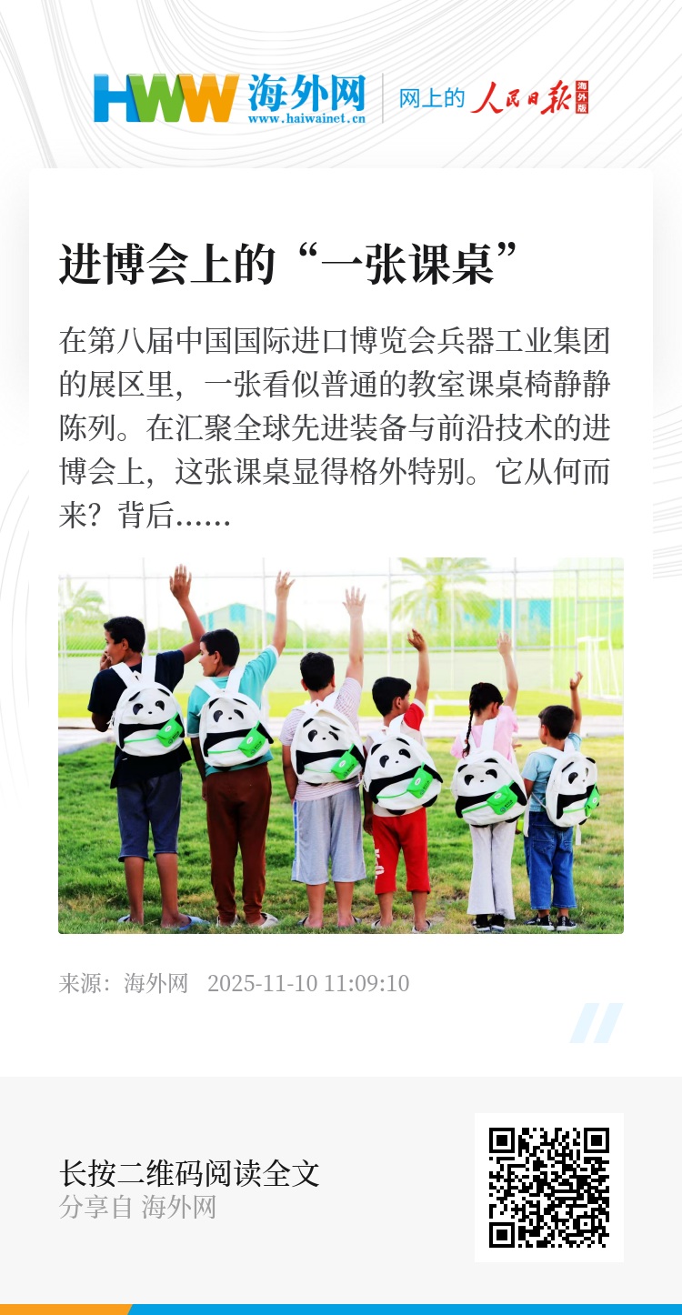 如今,这张承载着伊拉克孩子求学梦想的课桌,亮相进博会兵器工业集团展区,与展示振华石油绿色低碳发展、属地员工培养等内容的展陈相呼应,成为践行ESG理念的生动缩影。展区工作人员表示:“在海外捐建希望学校,既为当地孩子提供了教育机会,也搭建起中外民心相通的桥梁,实现了互利共赢。”