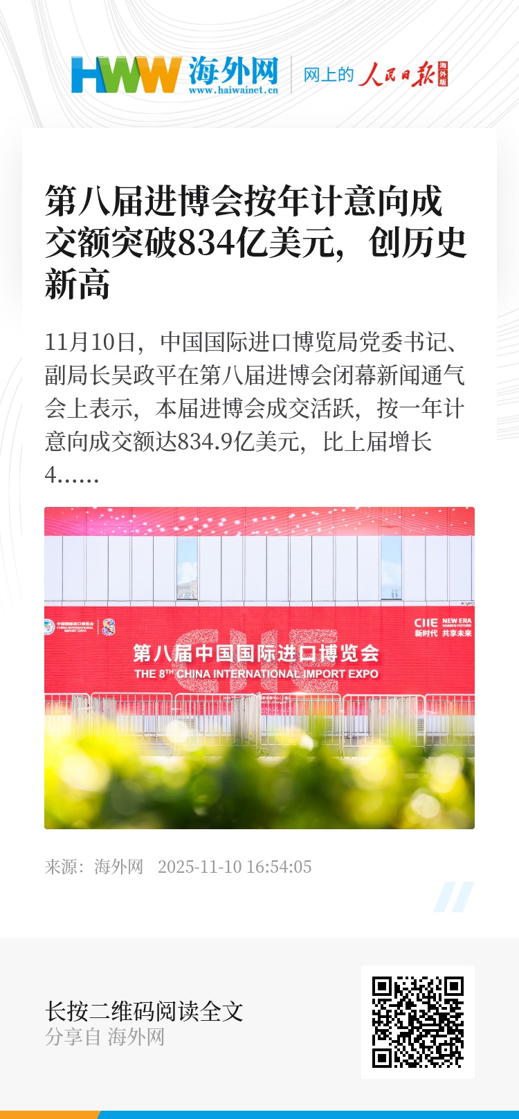 11月10日,中国国际进口博览局党委书记、副局长吴政平在第八届进博会闭幕新闻通气会上表示,本届进博会成交活跃,按一年计意向成交额达834.9亿美元,比上届增长4.4%,创历史新高。