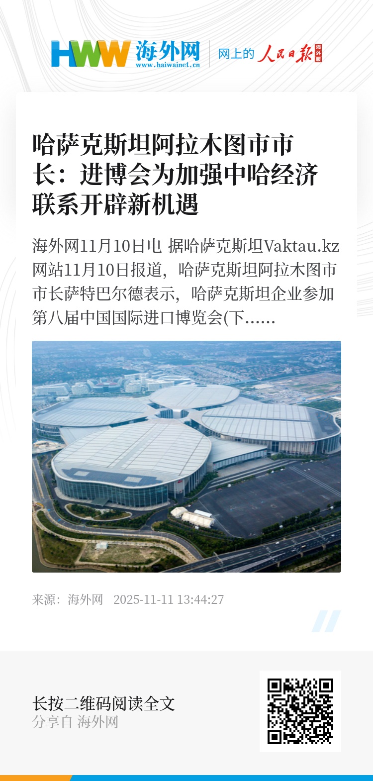 海外网11月10日电 据哈萨克斯坦Vaktau.kz网站11月10日报道,哈萨克斯坦阿拉木图市市长萨特巴尔德表示,哈萨克斯坦企业参加第八届中国国际进口博览会(下文简称“进博会”),为加强中国与哈萨克斯坦经济联系开辟了新机遇。