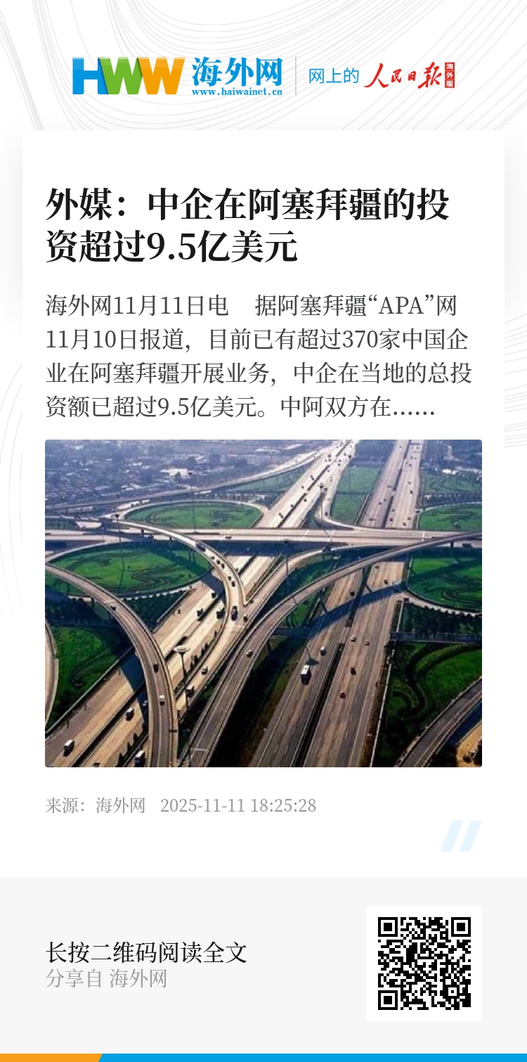 海外网11月11日电 据阿塞拜疆“APA”网11月10日报道,目前已有超过370家中国企业在阿塞拜疆开展业务,中企在当地的总投资额已超过9.5亿美元。中阿双方在绿色能源、智能电网、电动公交车、工业园区等领域的合作取得积极成果。(海外网 张英杰)
