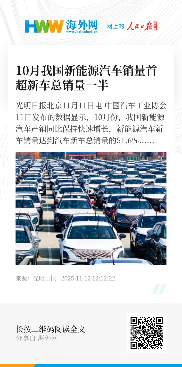光明日报北京11月11日电 中国汽车工业协会11日发布的数据显示,10月份,我国新能源汽车产销同比保持快速增长,新能源汽车新车销量达到汽车新车总销量的51.6%,占有率首次过半。