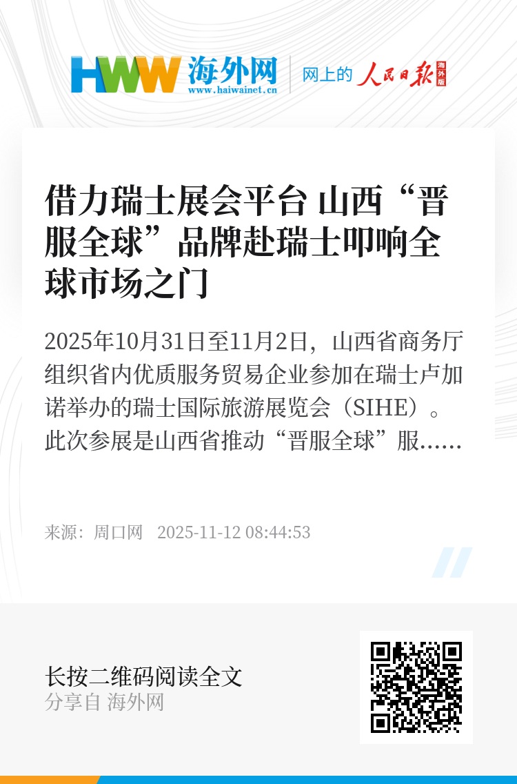 2025年10月31日至11月2日,山西省商务厅组织省内优质服务贸易企业参加在瑞士卢加诺举办的瑞士国际旅游展览会(SIHE)。此次参展是山西省推动“晋服全球”服务贸易品牌国际化、增强山西在全球产业链中影响力的关键举措。
