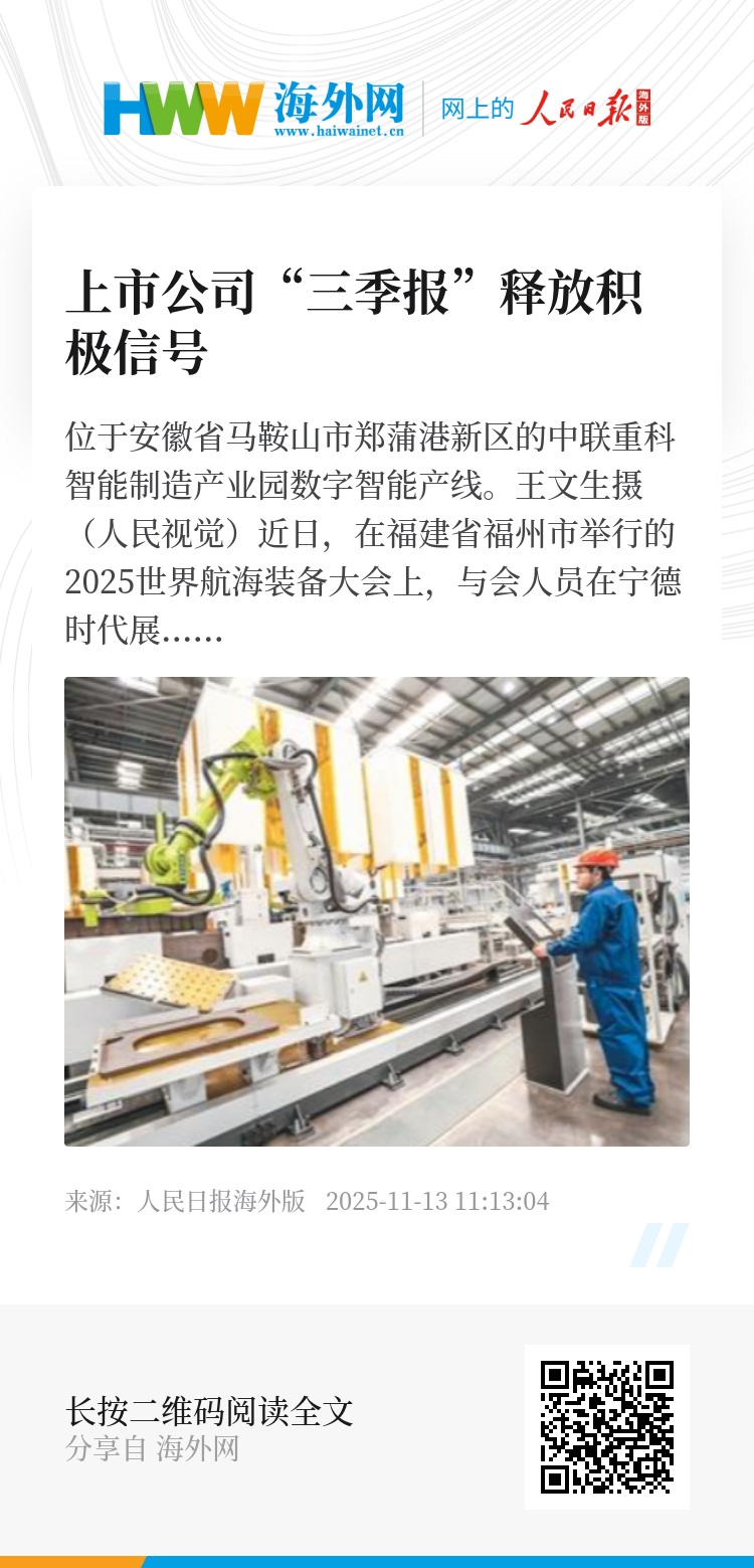 中国上市公司协会发布的数据显示,今年前三季度,A股上市公司合计实现营业收入53.46万亿元,净利润4.7万亿元,全市场共4183家上市公司实现盈利,盈利面近八成。第三季度上市公司营收、净利润同比增长3.82%、11.45%,环比增长2.40%、14.12%,增速较上半年显著提升,逐季向好态势继续巩固。其中,新能源汽车、固态电池、超硬材料、影视院线、快递物流等多个行业表现突出。透过这份成绩单会发现,中国上市公司业绩持续改善,科创引领作用凸显,产业结构焕新升级,高质量发展迈出坚实步伐。