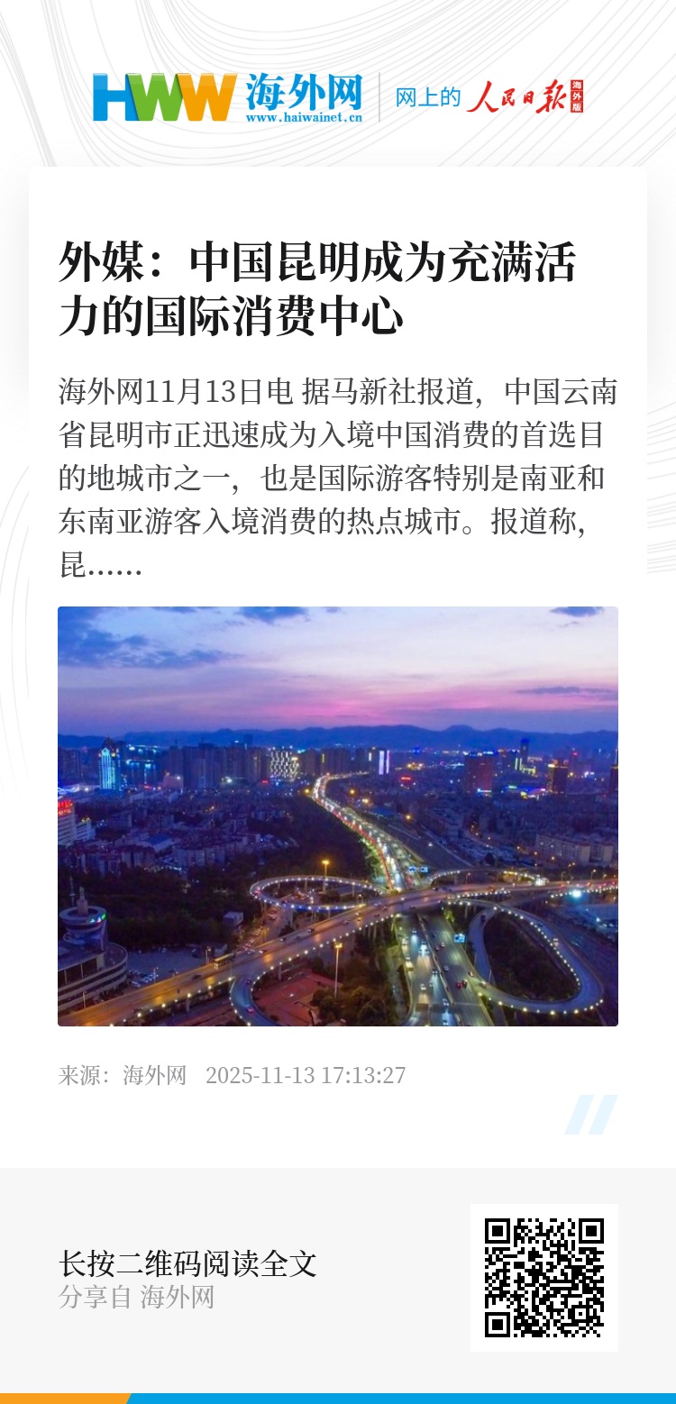 海外网11月13日电 据马新社报道,中国云南省昆明市正迅速成为入境中国消费的首选目的地城市之一,也是国际游客特别是南亚和东南亚游客入境消费的热点城市。