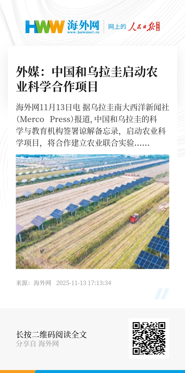 海外网11月13日电 据乌拉圭南大西洋新闻社(Merco Press)报道,中国和乌拉圭的科学与教育机构签署谅解备忘录,启动农业科学项目,将合作建立农业联合实验室,以加强农业创新合作。