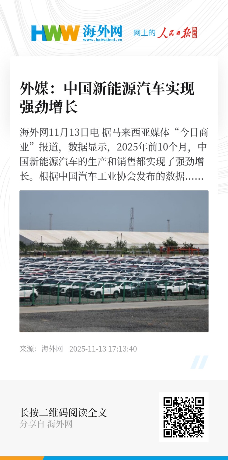 海外网11月13日电 据马来西亚媒体“今日商业”报道,数据显示,2025年前10个月,中国新能源汽车的生产和销售都实现了强劲增长。