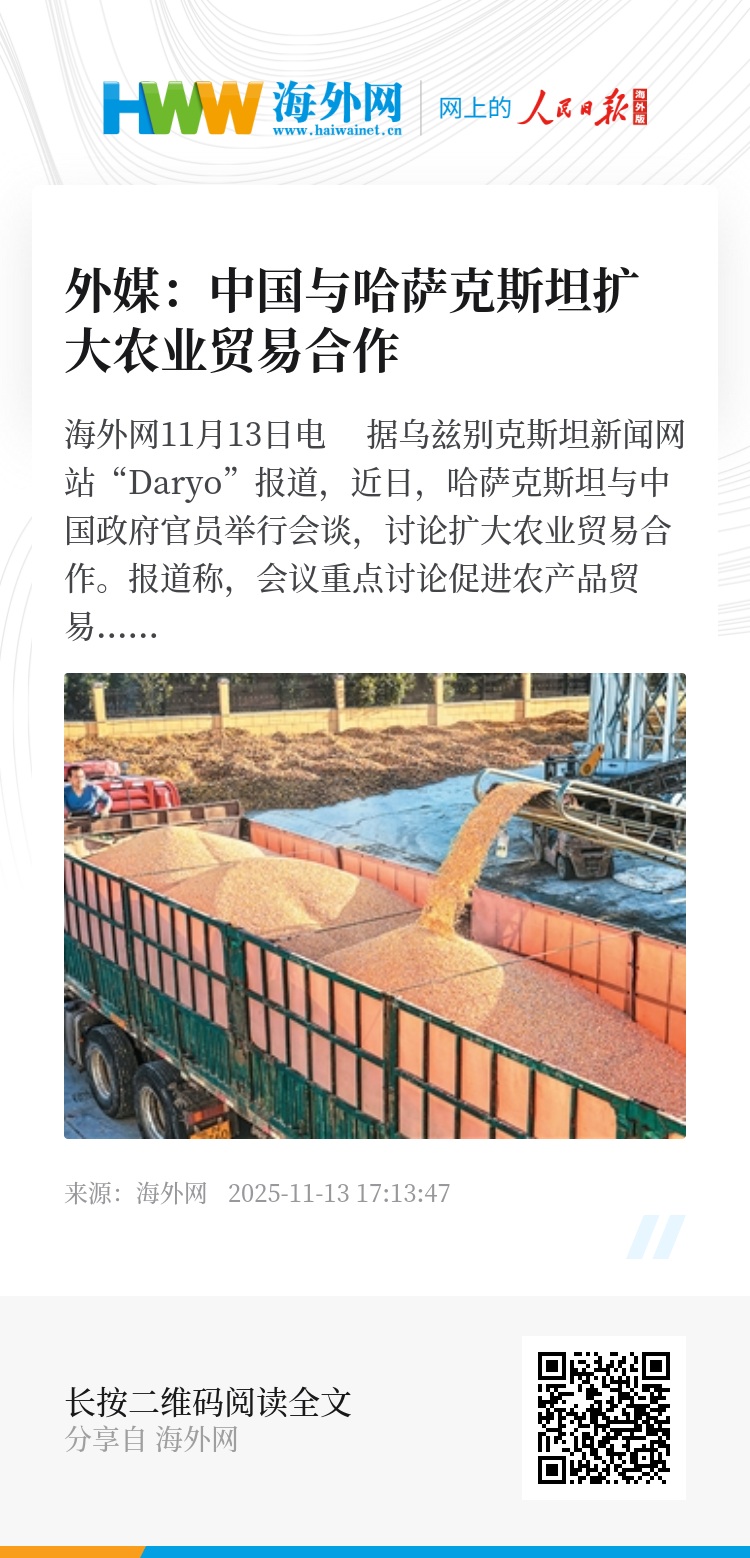 海外网11月13日电 据乌兹别克斯坦新闻网站“Daryo”报道,近日,哈萨克斯坦与中国政府官员举行会谈,讨论扩大农业贸易合作。