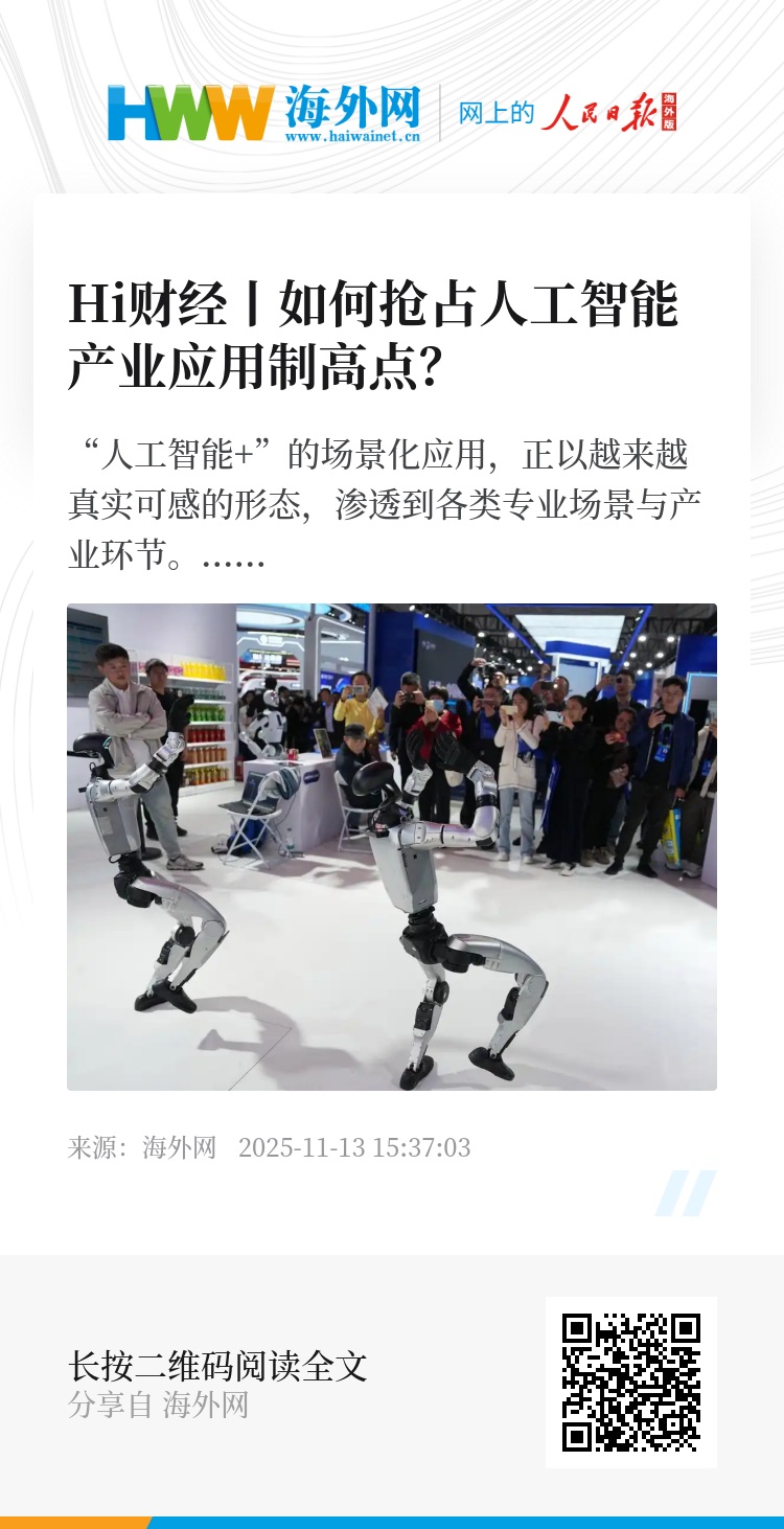 从技术突破到产业落地,从政策护航到生态构建,中国人工智能发展的“加速度”已然启动。面向未来,随着人工智能技术持续突破与应用深化,“人工智能+”必将更加广泛地融入经济社会各领域,从工业制造到公共服务,从文化创意到社会治理,推动产业智能化升级和运行效率提升。(海外网 穆瑀宸)