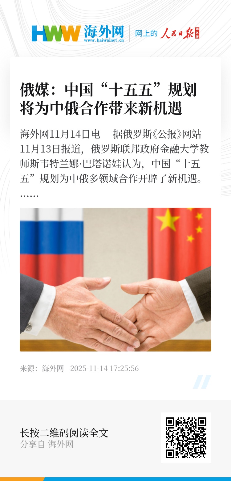 海外网11月14日电 据俄罗斯《公报》网站11月13日报道,俄罗斯联邦政府金融大学教师斯韦特兰娜·巴塔诺娃认为,中国“十五五”规划为中俄多领域合作开辟了新机遇。