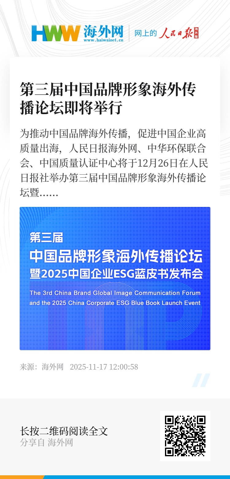 为推动中国品牌海外传播,促进中国企业高质量出海,人民日报海外网、中华环保联合会、中国质量认证中心将于12月26日在人民日报社举办第三届中国品牌形象海外传播论坛暨2025中国企业ESG蓝皮书发布会。