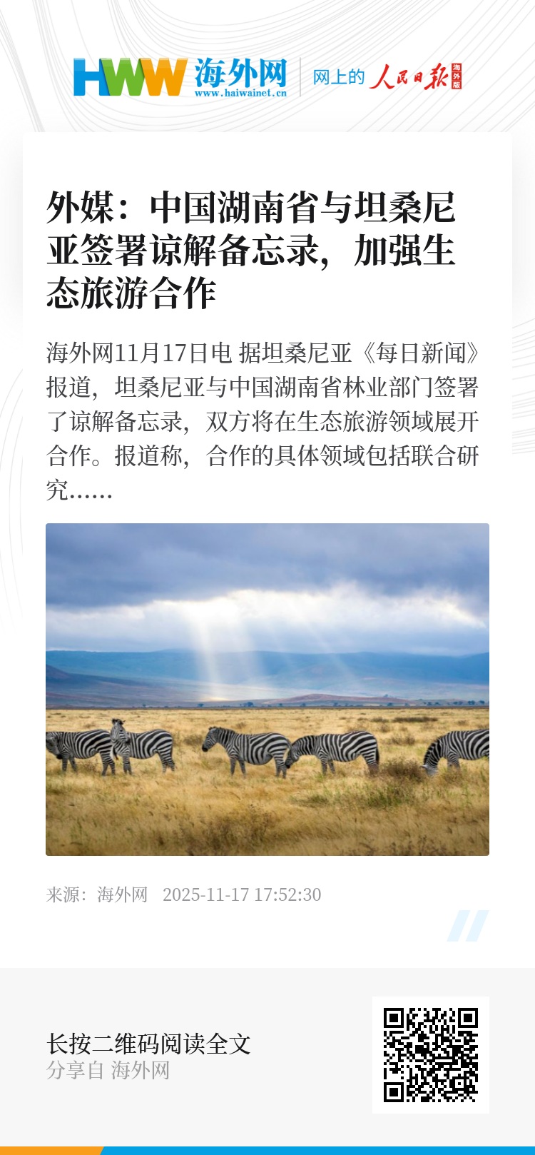 海外网11月17日电 据坦桑尼亚《每日新闻》报道,坦桑尼亚与中国湖南省林业部门签署了谅解备忘录,双方将在生态旅游领域展开合作。