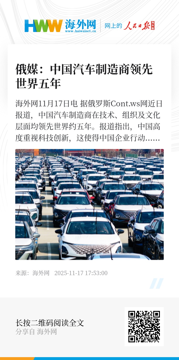 海外网11月17日电 据俄罗斯Cont.ws网近日报道,中国汽车制造商在技术、组织及文化层面均领先世界约五年。