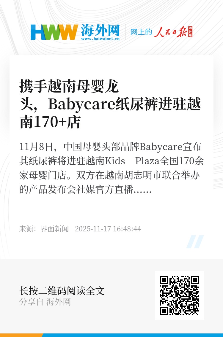 11月8日,中国母婴头部品牌Babycare宣布其纸尿裤将进驻越南Kids Plaza全国170余家母婴门店。双方在越南胡志明市联合举办的产品发布会社媒官方直播实时在线观看人数超过3000人,引发当地消费者高度关注。