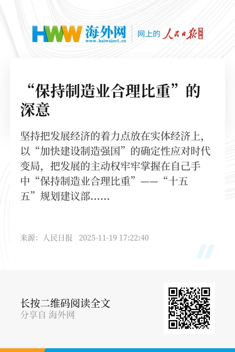 “保持制造业合理比重”——“十五五”规划建议部署“建设现代化产业体系,巩固壮大实体经济根基”这一重要战略任务时,突出强调了这一点。