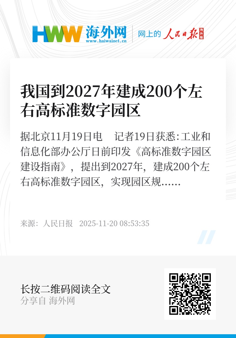 据新华社北京11月19日电 记者19日获悉:工业和信息化部办公厅日前印发《高标准数字园区建设指南》,提出到2027年,建成200个左右高标准数字园区,实现园区规上工业企业数字化改造全覆盖。