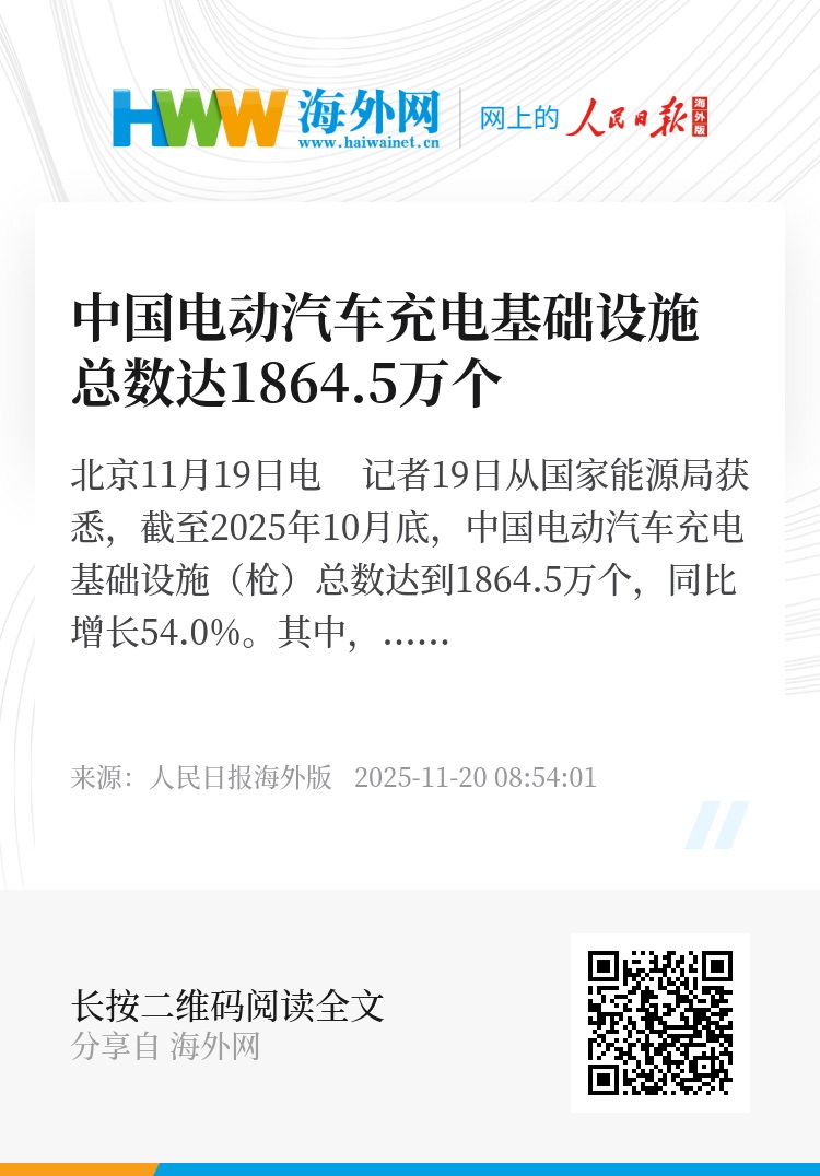 新华社北京11月19日电 记者19日从国家能源局获悉,截至2025年10月底,中国电动汽车充电基础设施(枪)总数达到1864.5万个,同比增长54.0%。