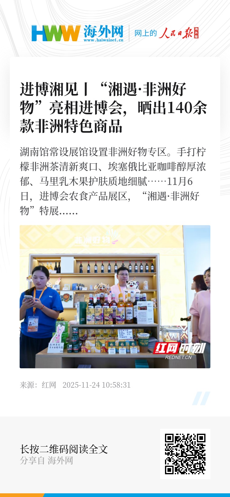 同时,在湖南馆常设展馆设置非洲好物专区,200余款产品可销可展可售,打造中国老百姓身边的非洲驿站,让更多非洲非资源性产品走进中国市场。