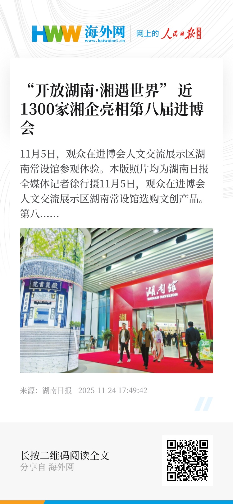 第八届中国国际进口博览会(简称“进博会”)上,湖南近1300家企业及3400余名专业观众参展参会。
