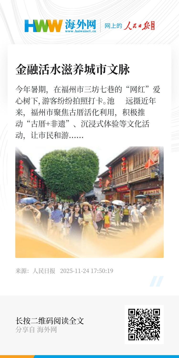 “有了金融强有力的支持,近年来福州名城保护开发有限公司大力推动文商旅融合运营,通过引入沉浸式戏剧、非遗体验、文化展览等新业态,使古厝‘活’起来。仅2025年上半年,我们运营的五大历史文化街区就累计接待游客约2112万人次,同比增长10.35%,并带动了周边消费。”福州名城保护开发有限公司党委委员、副总经理白宝霞表示,公司还将继续挖掘存量资产价值,探索开展引入商业地产抵押贷款支持证券以及大型经营资产经营物业贷、类REITs(不动产投资信托基金)等资产融资工作,让金融活水更好赋能文旅产业,进一步滋养文化根脉。