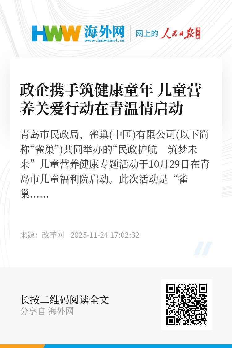 青岛市民政局、雀巢(中国)有限公司(以下简称“雀巢”)共同举办的“民政护航 筑梦未来”儿童营养健康专题活动于10月29日在青岛市儿童福利院启动。此次活动是“雀巢健康儿童计划”在青岛的深化实践,标志着双方在推动儿童营养健康与福利事业方面迈入政企协同、资源共融的新阶段。