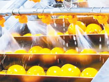 在浙江艾佳果蔬开发有限责任公司,胡柚正在生产线上进行清洗。