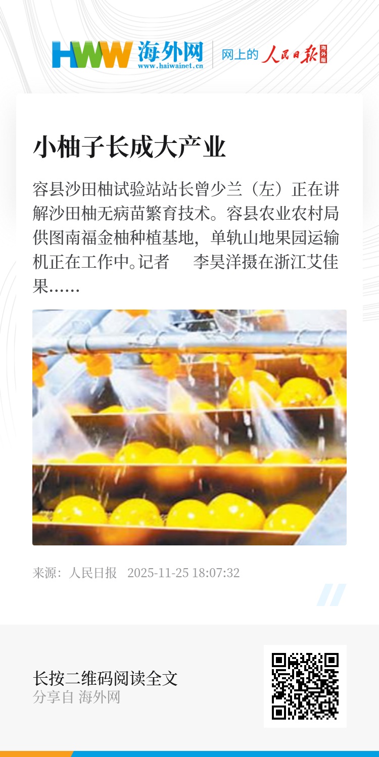 容县坚持科技赋能,与科研机构合作建立种质资源库,打造种苗繁育基地。目前全县沙田柚种植面积达24.5万亩,预计今年柚果产量达43万吨,综合产值超45亿元,柚子成为广大农民的“致富果”。