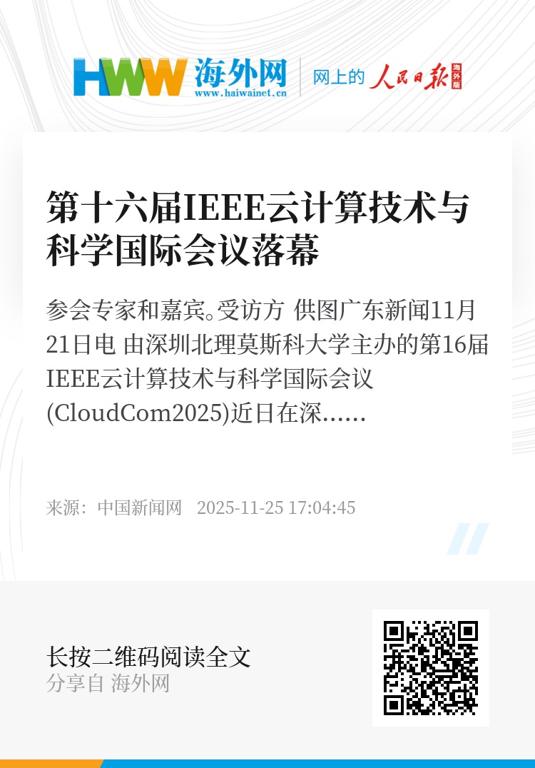 中新网广东新闻11月21日电 由深圳北理莫斯科大学主办的第16届IEEE云计算技术与科学国际会议(CloudCom2025)近日在深圳举行。